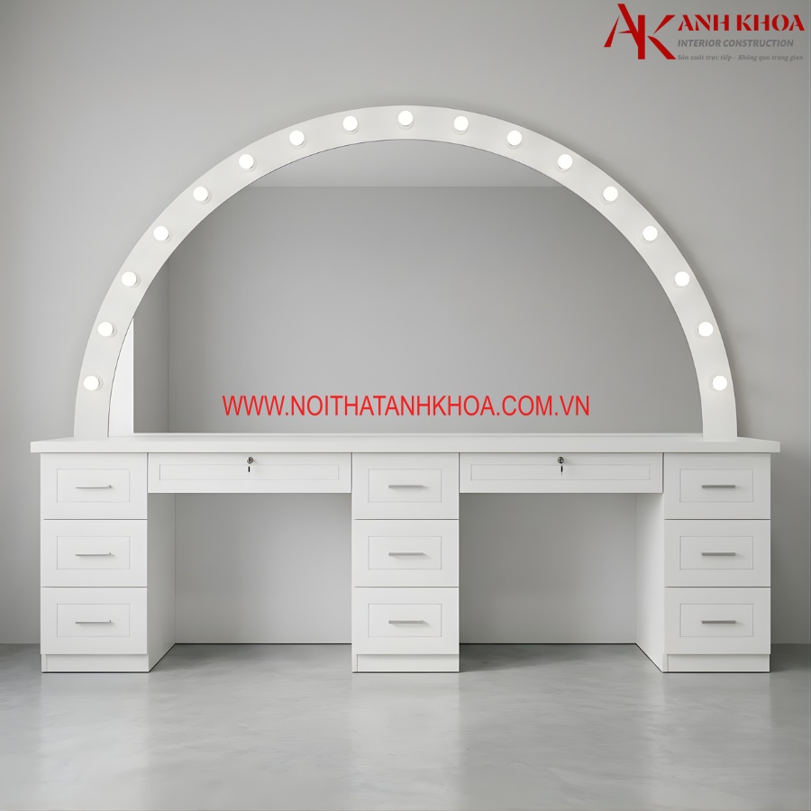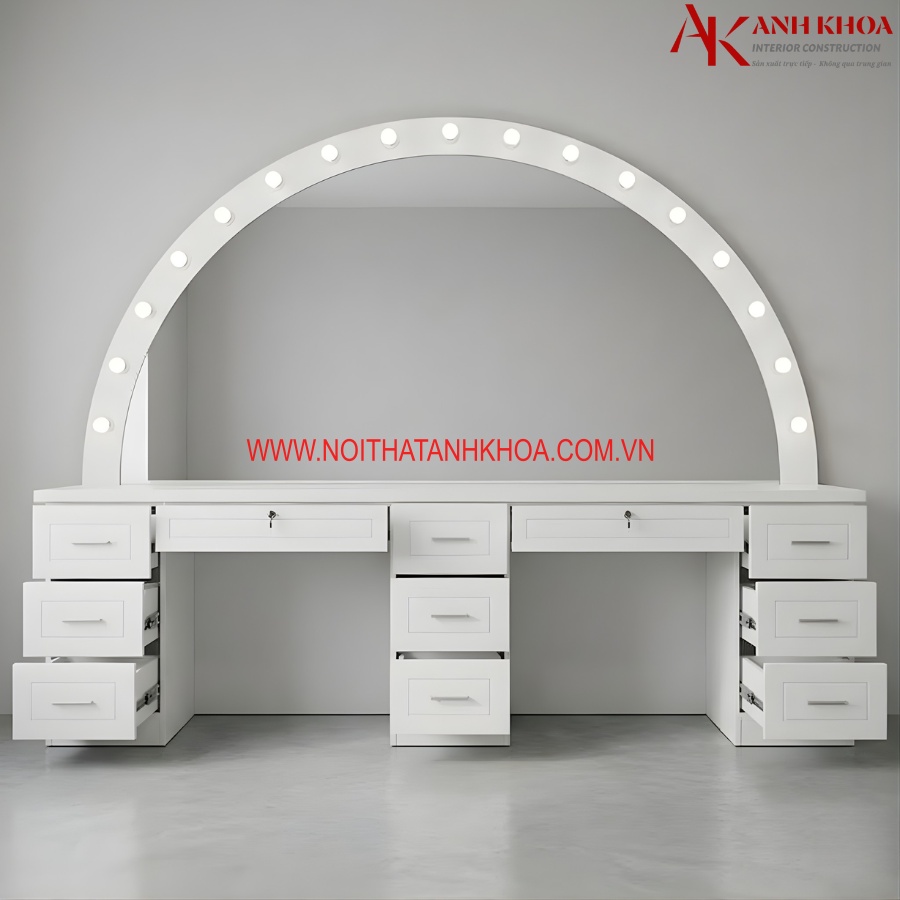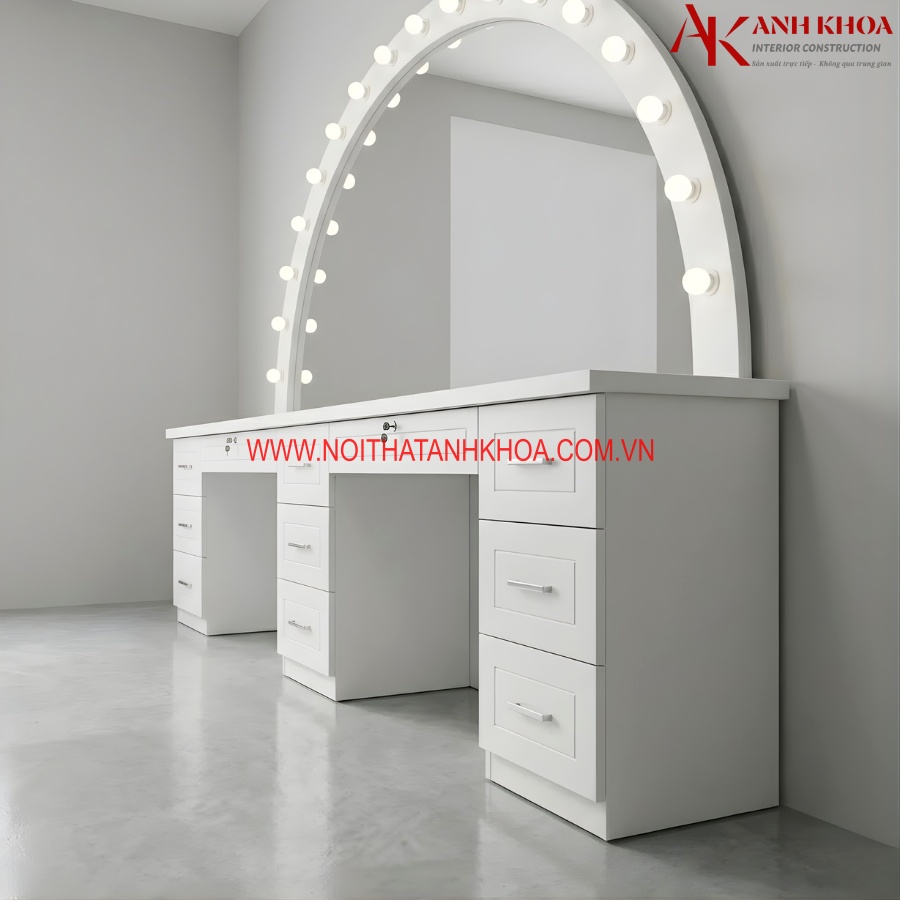 Ảnh thực tế: Bàn trang điểm dài gỗ MDF màu trắng có đèn tròn trắng đẹp