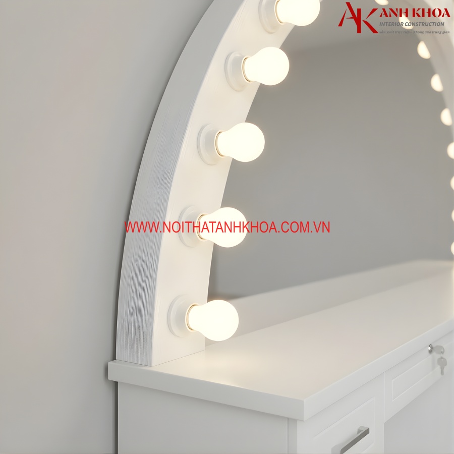 Ảnh thực tế: Bàn trang điểm dài gỗ MDF màu trắng có đèn tròn trắng