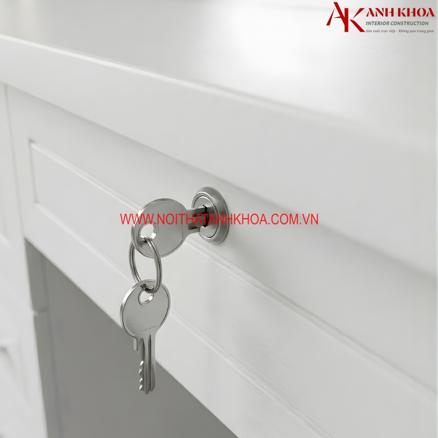 Ảnh thực tế: Ổ khóa bàn phấn trang điểm dài gỗ MDF màu trắng