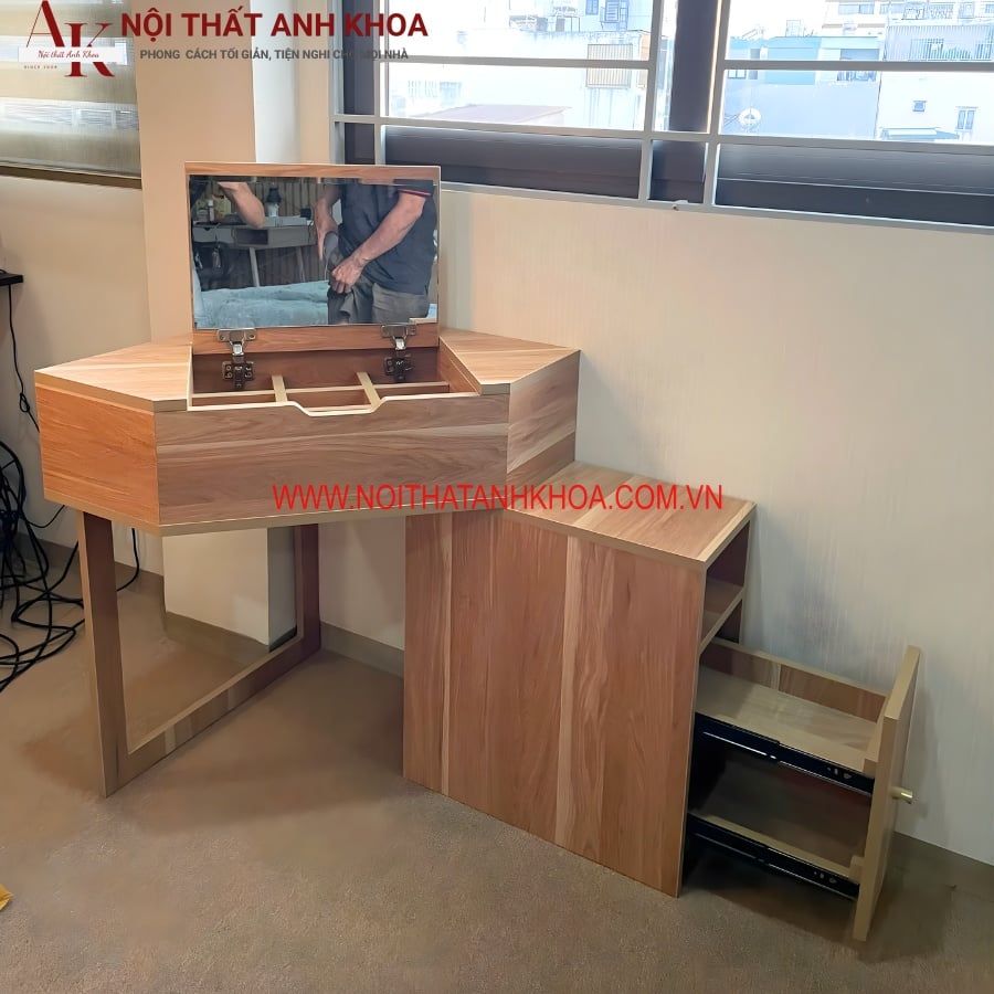 Được thiết kế với sự chú trọng tối đa đến vẻ đẹp và tiện ích dành cho phái nữ, giúp tôn vinh nét đẹp dịu dàng và thanh lịch của người sử dụng. Mẫu bàn trang điểm này của Anh Khoa không chỉ mang lại không gian trang điểm lý tưởng mà còn được trang bị các tính năng thông minh như gương gập, ngăn kéo ẩn, và kệ lưu trữ rộng rãi.