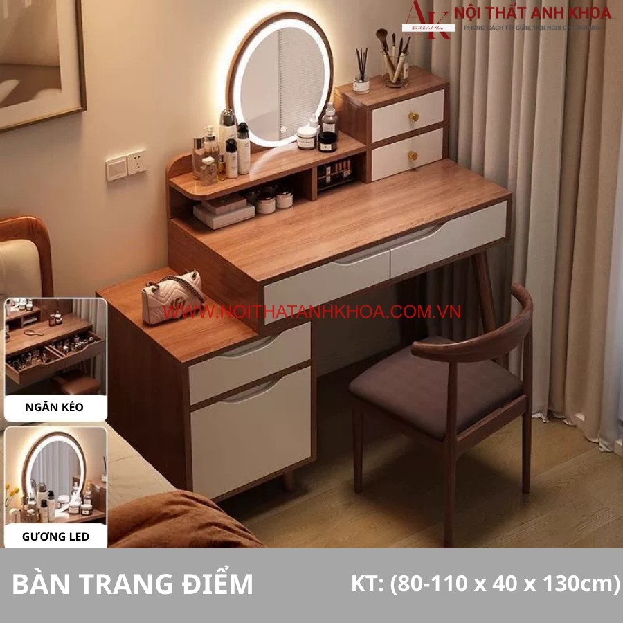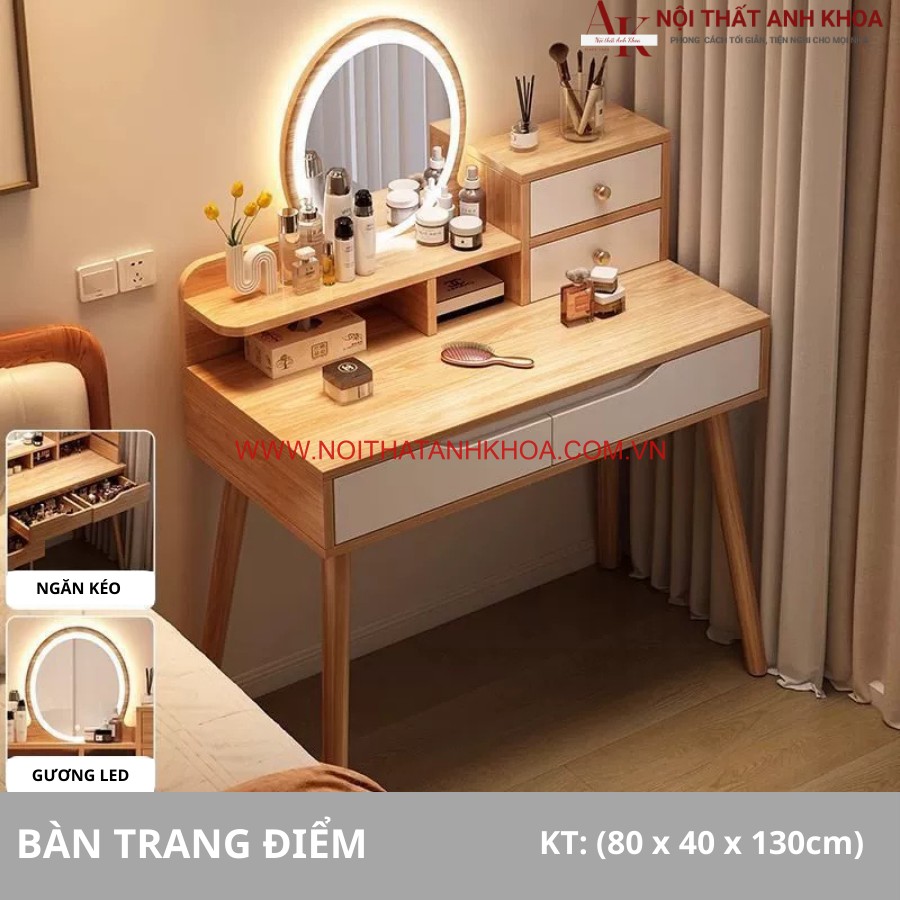 Kết hợp với hệ thống đèn led hiện đại, bàn trang điểm không chỉ đáp ứng nhu cầu làm đẹp mà còn góp phần tạo nên không gian sang trọng, tiện nghi. Sự chắc chắn của chất liệu gỗ cùng với thiết kế tối ưu giúp sản phẩm trở thành lựa chọn hoàn hảo cho mọi phong cách nội thất.