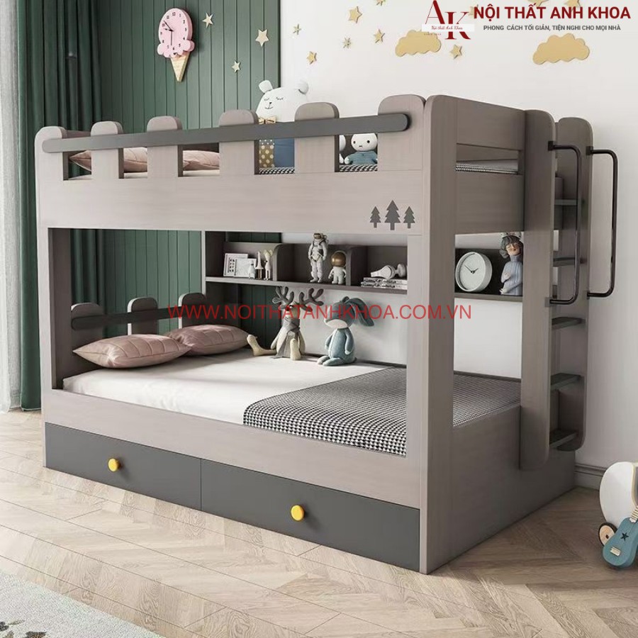 Điểm nhấn của sản phẩm là phong cách thiết kế tối giản, tập trung vào công năng và sự an toàn. Phần lan can tầng trên được thiết kế cao ráo với các thanh chắn có khoảng cách hợp lý, đảm bảo an toàn tuyệt đối cho bé khi ngủ. Các chi tiết nhỏ như họa tiết cây thông trang trí, núm kéo màu vàng nổi bật tạo nên một tổng thể hài hòa, tinh tế, mang lại vẻ đẹp năng động và không kém phần ấm cúng cho căn phòng.