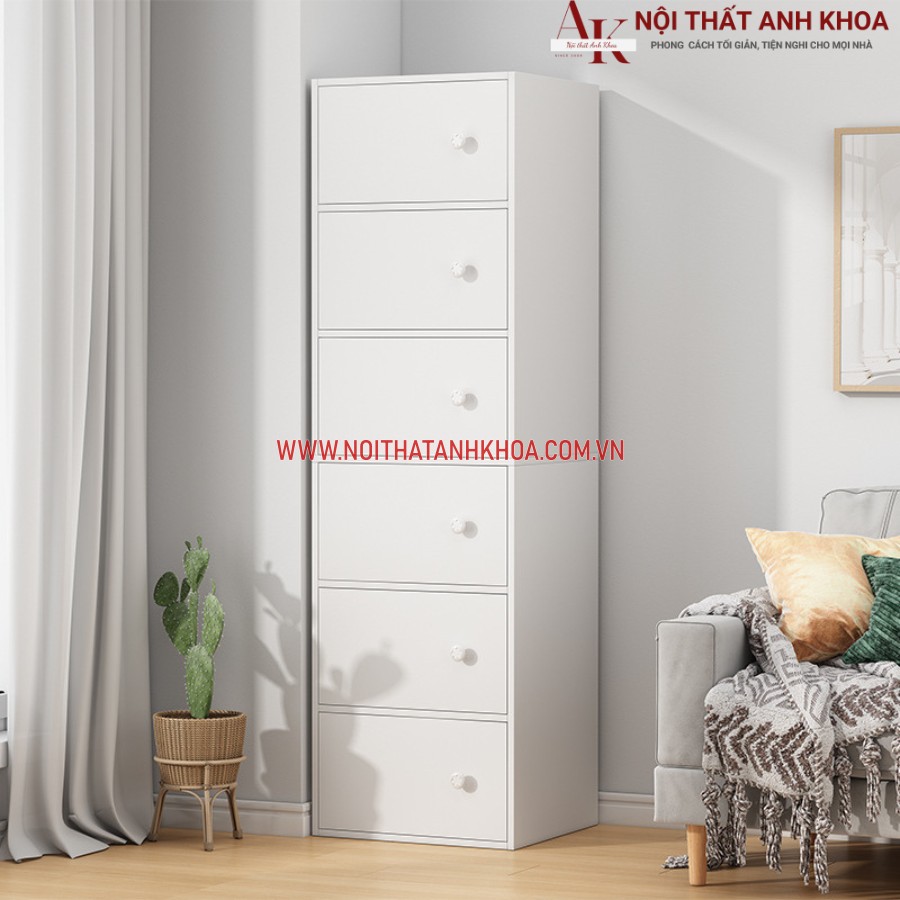 Dạng tủ đứng hình chữ nhật vớ 6 ngăn tủ riêng biệt có cánh che, tạo nên một tổng thể gọn gàng, liền mạch. Thiết kế này giúp che đi những vật dụng bên trong, tránh cảm giác bừa bộn, lộn xộn.