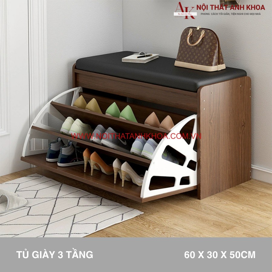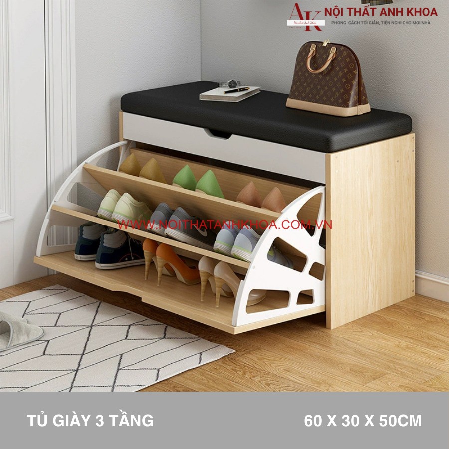 Kệ giày tại Anh Khoa có dạng hình chữ nhật ngang, phần trên cùng của kệ được bọc nệm êm ái, có thể sử dụng một băng ghế ngồi tiện lợi. Bên dưới là hệ thống tủ giày thông minh với cánh lật, giúp tối ưu hóa không gian lưu trữ.