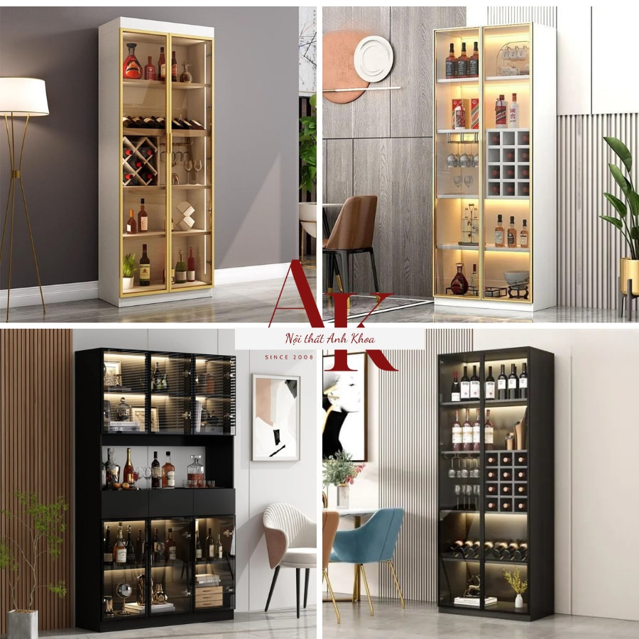 Ưu điểm nổi bật của tủ rượu cánh kính trong suốt giúp phô diễn vẻ đẹp của bộ sưu tập rượu, tạo điểm nhấn sang trọng và tinh tế cho không gian. Tại Nội Thất Anh Khoa tủ rượu có nhiều kích thước, kiểu dáng và màu sắc khác nhau, phù hợp với mọi phong cách nội thất.