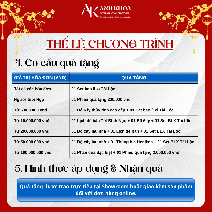 Chương trình dành cho tất cả khách hàng mua sắm trực tiếp tại hệ thống Showroom hoặc đặt hàng Online qua Website, Fanpage chính thức của nội thất Anh Khoa.