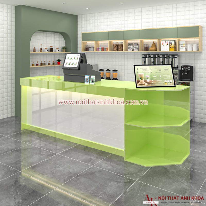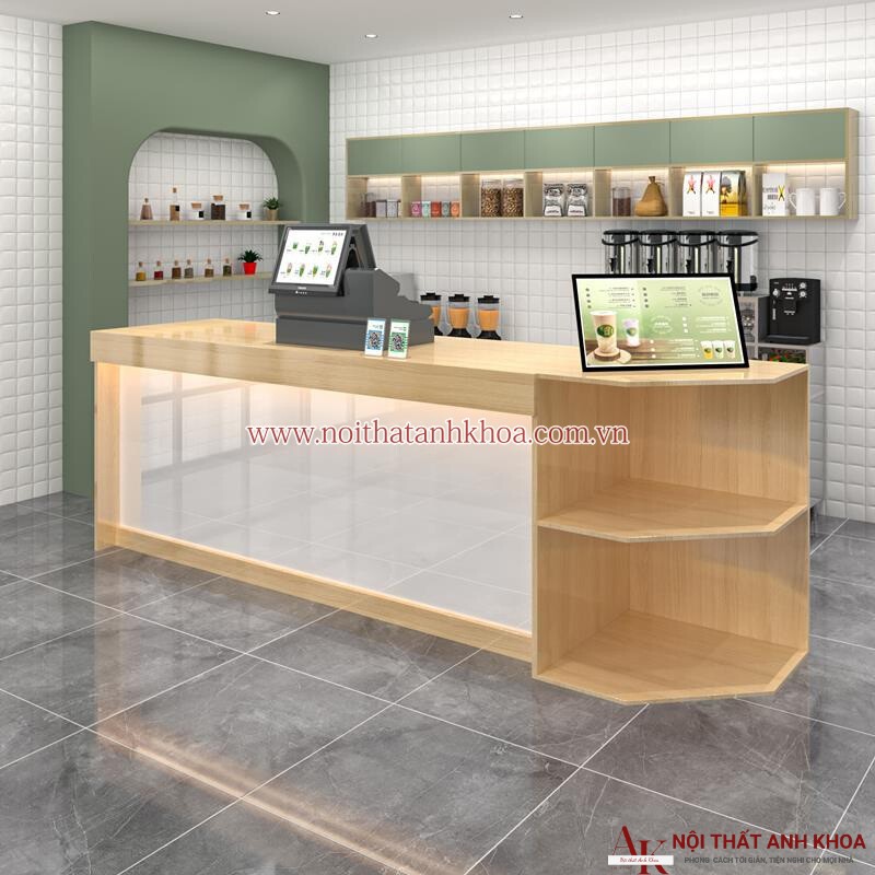 Các góc cạnh được bo tròn một cách tinh tế, đảm bảo sự an toàn và tăng tính thẩm mỹ. Ngoài ra, quầy còn được tích hợp các kệ mở ở góc bên phải, vừa tạo điểm nhấn vừa giúp sắp xếp đồ dùng một cách gọn gàng. Tổng thể thiết kế mang phong cách hiện đại, phù hợp với các không gian như: Quán trà sữa, cà phê hoặc nhà hàng.
