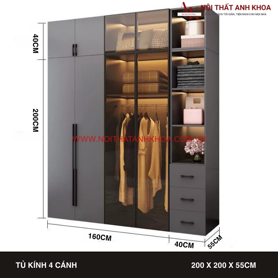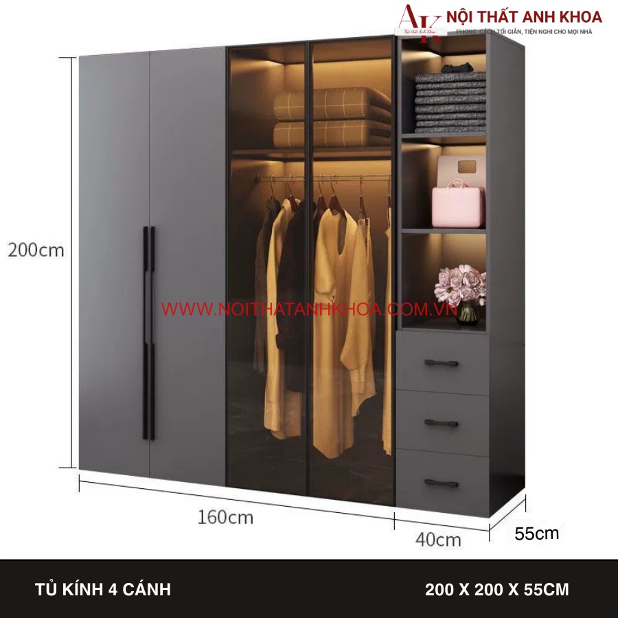 Mẫu tủ áo tại Anh Khoa mang phong cách hiện đại và sang trọng, phù hợp với không gian sống tinh tế. Thiết kế tinh gọn với gam màu xám trầm kết hợp cùng cánh kính trong suốt giúp không gian trở nên rộng rãi và đẳng cấp hơn.