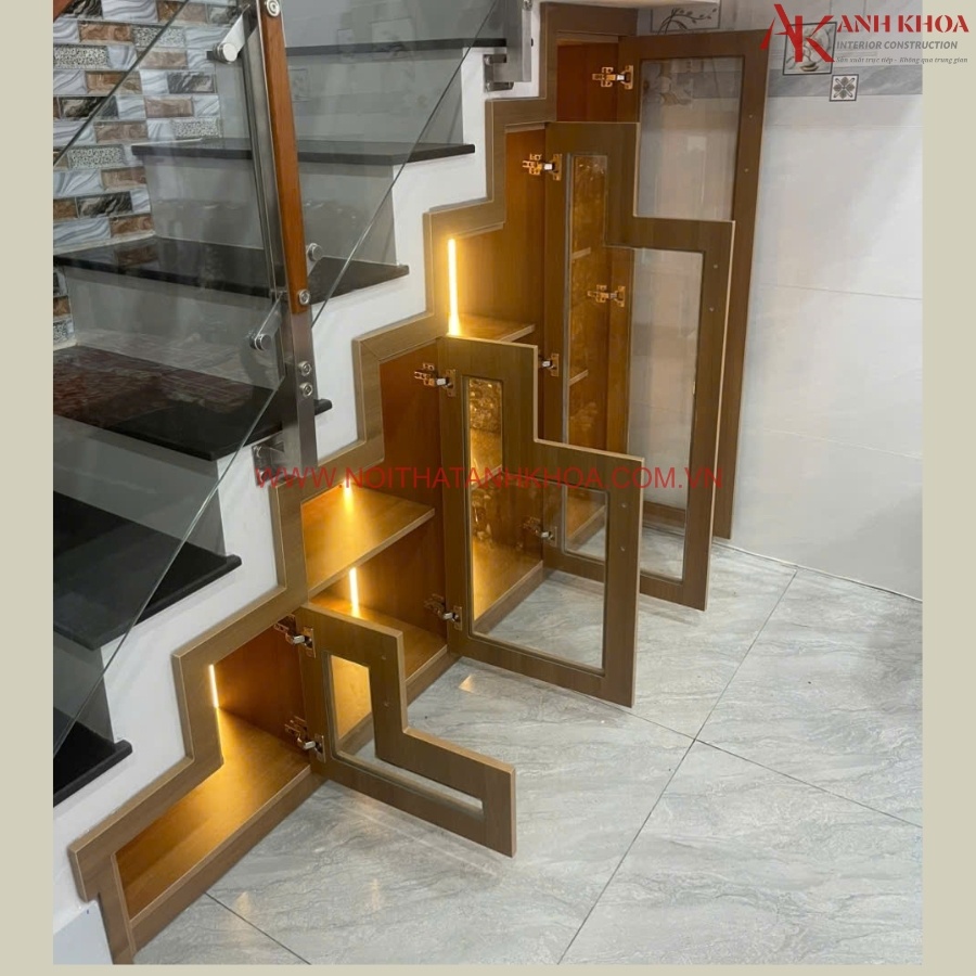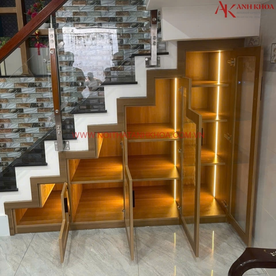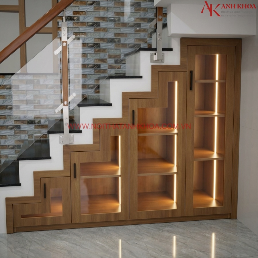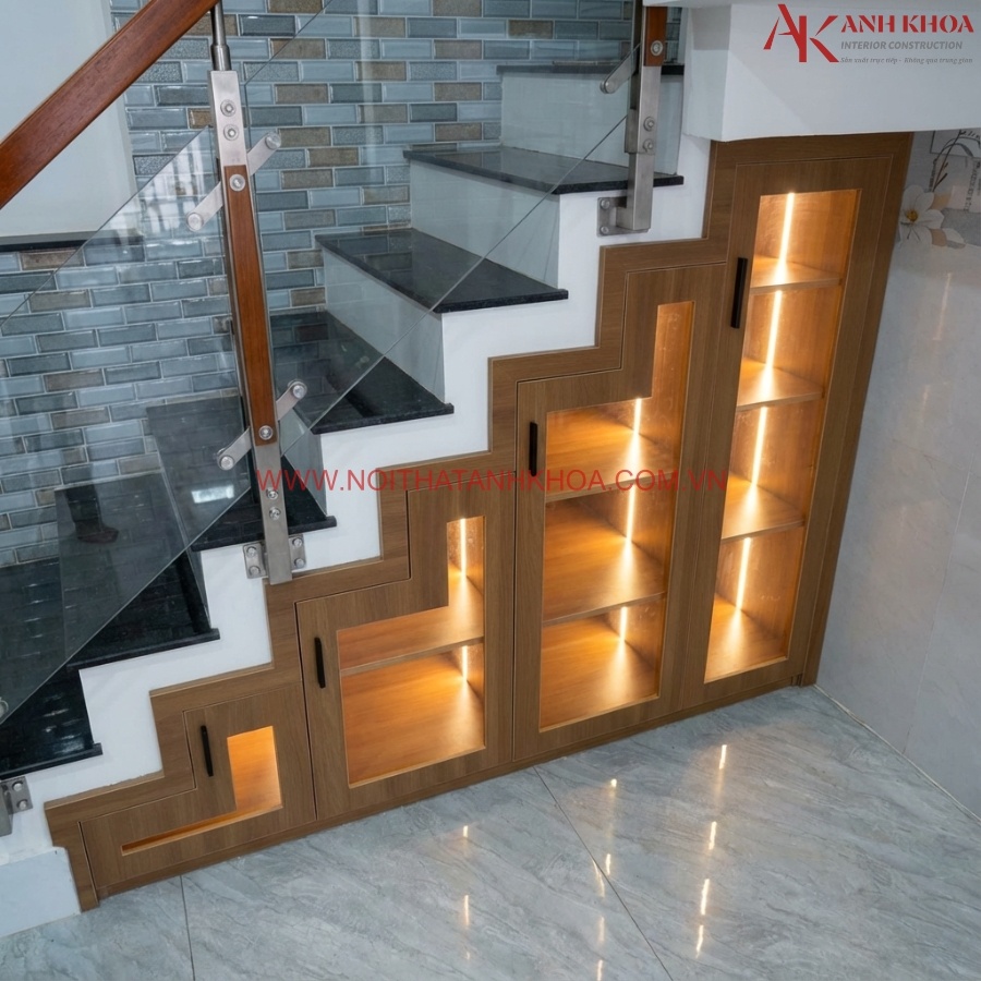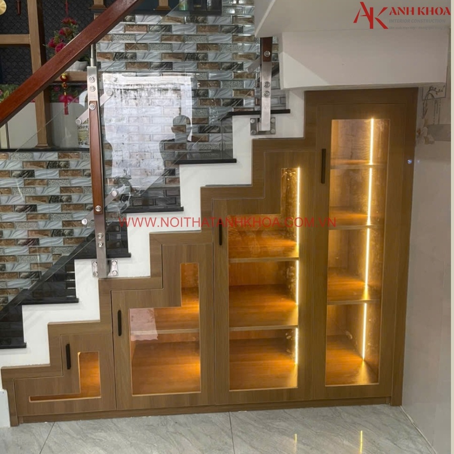 Bạn đang sở hữu một căn nhà phố hay biệt thự và muốn tận dụng tối đa diện tích nhưng vẫn phải đảm bảo sự sang trọng? Đừng để khoảng trống dưới cầu thang trở nên đơn điệu và bám bụi. Tại nội thất Anh Khoa, chúng tôi mang đến giải pháp đột phá: Tủ chân cầu thang gỗ công nghiệp phối cánh kính có Led. Sự xuất hiện của hệ thống đèn LED âm tủ không chỉ giúp trưng bày những chai rượu quý hay đồ lưu niệm thêm phần rực rỡ, mà còn biến góc nhỏ này thành một sân khấu ánh sáng đầy lôi cuốn, thay đổi hoàn toàn diện mạo không gian sống của bạn.