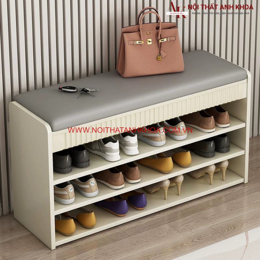 - Mặt ghế nệm êm ái: Phần trên của tủ được thiết kế một băng ghế có nệm, tạo sự tiện lợi khi mang giày hoặc nghỉ ngơi.