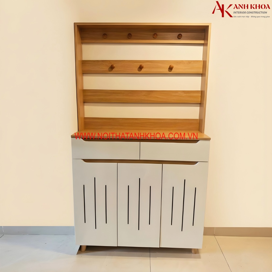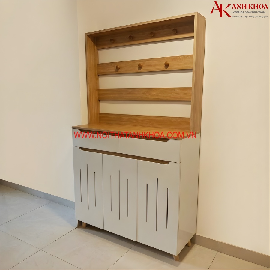 Đặc điểm nổi bật nhất là sự kết hợp liền khối. Phần dưới là một tủ kín đáo, thường sử dụng cánh mở hoặc cánh lật để bảo quản giày dép khỏi bụi bẩn. Phần trên là một không gian mở với các thanh ngang và móc treo tiện lợi để treo áo khoác, khăn choàng, túi xách, mũ bảo hiểm...