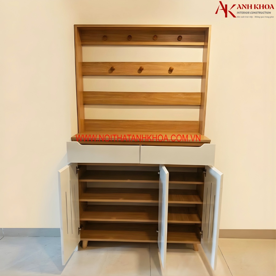Lối ra vào là "Bộ mặt" của mỗi ngôi nhà, là nơi đầu tiên chào đón bạn trở về sau một ngày dài và cũng là nơi tạo ấn tượng đầu tiên cho những vị khách ghé thăm. Tuy nhiên, ở các căn hộ chung cư hay những ngôi nhà có diện tích khiêm tốn, khu vực này thường dễ trở nên bừa bộn với giày dép, áo khoác, mũ nón và túi xách. Thấu hiểu điều đó, nội thất Anh Khoa mang đến sản phẩm tủ giày thông minh kết hợp treo đồ TGAK_054 - Một giải pháp "2 trong 1" thích hợp, không chỉ giải quyết vấn đề lưu trữ mà còn nâng tầm thẩm mỹ cho không gian sống của bạn.