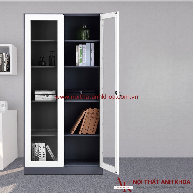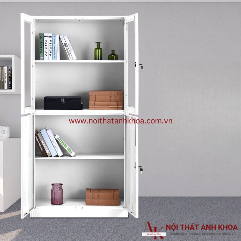 - Ngăn trên có cửa kính: Giúp dễ dàng quan sát và lấy tài liệu nhanh chóng, thích hợp để trưng bày hồ sơ quan trọng hoặc vật dụng trang trí.