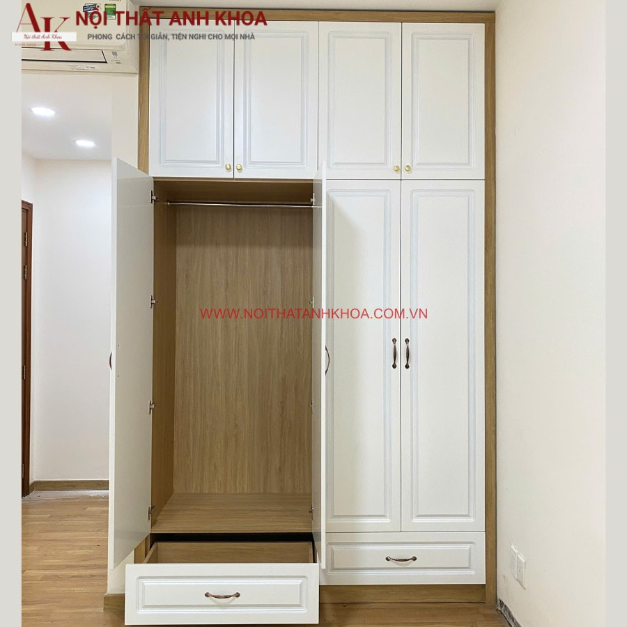 Ngăn kéo tiện lợi: Hai ngăn kéo lớn phía dưới là không gian tuyệt vời cho đồ lót, phụ kiện, hoặc những vật dụng cá nhân cần sự riêng tư và dễ dàng tìm kiếm. Sự kết hợp khoa học này giúp người dùng phân loại và sắp xếp đồ đạc một cách logic, tiết kiệm thời gian mỗi khi lựa chọn trang phục.