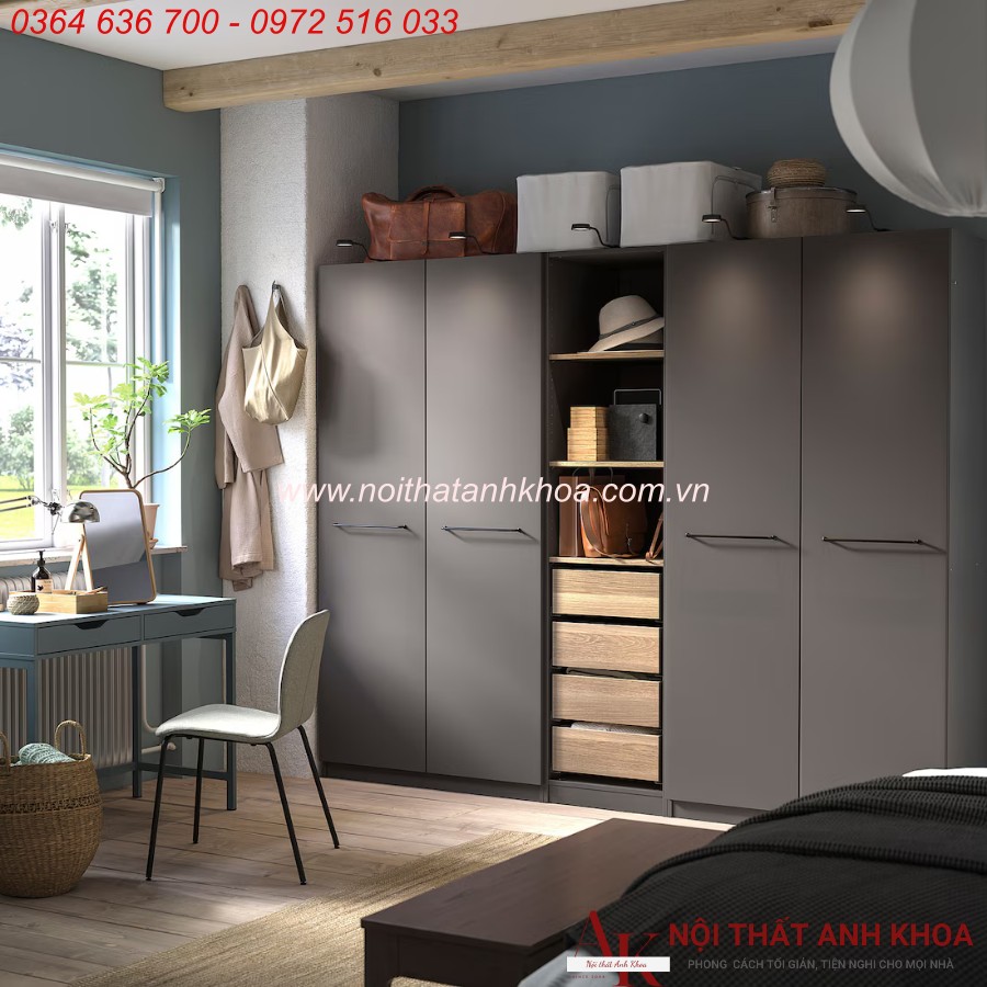 Bạn đang tìm kiếm một chiếc tủ quần áo với những chức năng tích hợp, kiểu dáng đẹp hay cả hai, Nội thất Anh Khoa sẽ nâng tầm không gian phòng ngủ của bạn bằng chiếc Tủ quần áo gỗ công nghiệp 4 cánh màu xám hiện đại_TAAT_002 này để thể hiện sự sang trọng và đương đại đang và đang là xu hướng thịnh hành được giới trẻ hiện nay lựa chọn. Chiếc tủ quần áo tích hợp nhiều tín năng trong khi vẫn giữ đồ đạc của bạn được sắp xếp gọn gàng và dễ lấy. Được chế tác với những đường nét gọn gàng và lớp hoàn thiện màu xám tinh xảo, liền mạch phù hợp với nhiều phong cách nội thất khác nhau, từ tối giản đến sang trọng đến hiện đại.