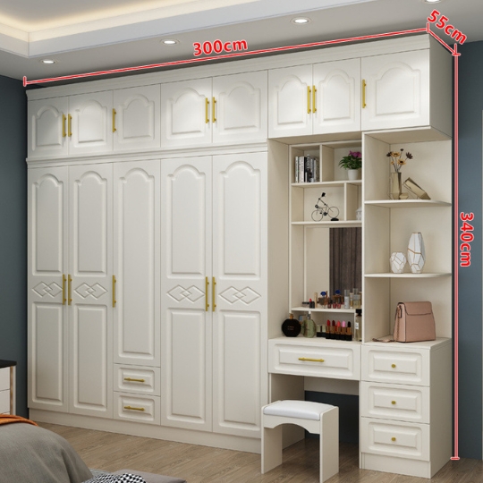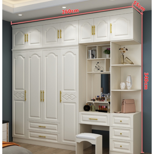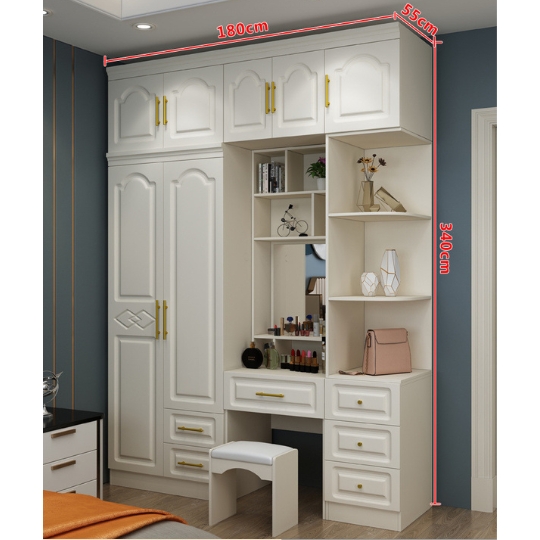 Về kích thước tủ, được đánh giá là khá lớn. Tủ có chiều ngang dao động từ 1m8 đến 2m2, chiều sâu 0,55m, chiều cao là 2,4m. Sở dĩ, tủ có kích thước lớn như này cũng là do tủ có tích hợp thêm bàn trang điểm và kệ trang trí nên phần kích thước bề ngang cũng hơi lớn hơn so với các mẫu tủ quần áo khác.
