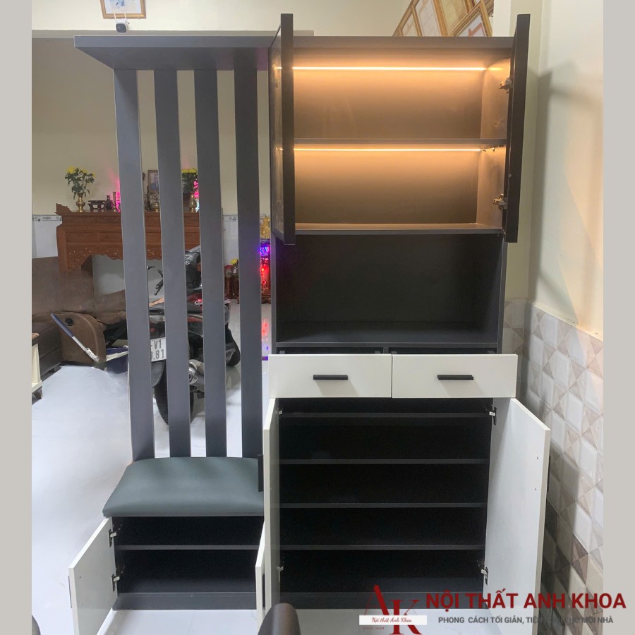 Vách Ngăn Gỗ Công Nghiệp Phủ Melamine Màu Xám Phối Trắng Hiện Đại của Nội Thất Anh Khoa là một giải pháp hiệu quả để phân chia không gian trong các căn hộ chung cư, nhà phố có diện tích nhỏ. Vách ngăn giúp tạo ra các không gian chức năng riêng biệt, đáp ứng nhu cầu sử dụng của các thành viên trong gia đình.
