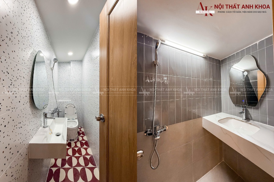 Mỗi phòng tắm mang một phong cách riêng. Một phòng sử dụng gạch ốp tường terrazzo cá tính kết hợp với gạch lát sàn họa tiết hình học nổi bật. Phòng còn lại theo đuổi vẻ đẹp sang trọng, tối giản với gạch ốp màu xám xi măng khổ lớn.